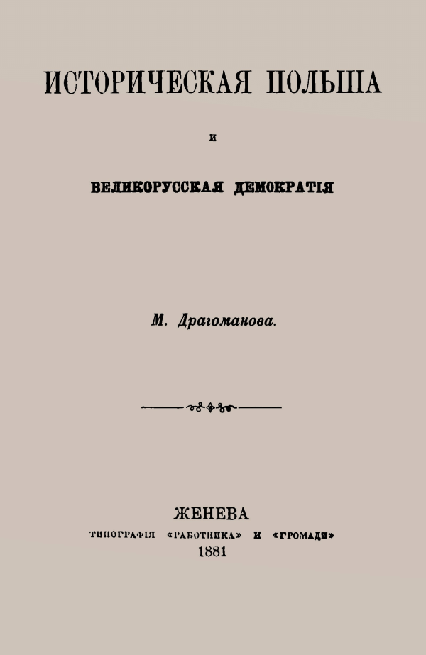 Историческая Польша и великорусская демократия [Текст] : (Отпечатки изъ "Вольнаго Слова" пересмотрѣнные и дополненные) / М. Драгоманов
