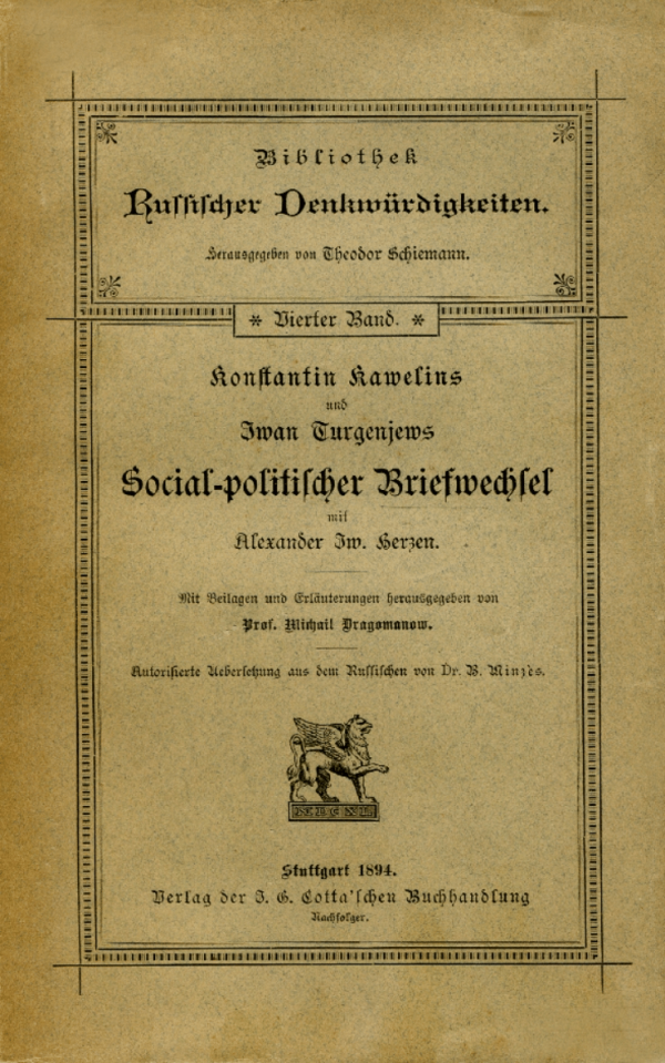 Konstantin Kawelins und Iwan Turgenjews sozial-politischer Briefwechsel mit Alexander Iw. Herzen [Текст] / Konstantin Kawelin ; Iwan Turgenjew ; Mit Beilagen und Erläuterungen hrsg. von Prof. Michail Dragomanow ; Autorisierte uebersetzung aus dem russischen, von dr. Boris Minzès